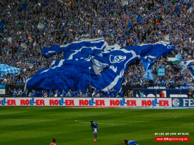 Vom Einlauf der Mannschaften bekamen weder ich, noch Felix, noch hunderte andere im Block nichts mit. Vor unseren Gesichtern waren die Farbtafeln ausgebreitet, eine kleine Wendechoreographie mit einer Botschaft in Richtung Vereinsführung. Auch die Schalker hatten etwas vorbereitet und formulierten ihre Liebe zu Blau-Weiß. Etwas merkwürdig, zeigten sie sich in letzter Zeit doch massiv unzufrieden mit ihrer Mannschaft, die zuerst die Champions League verspielte und nun sogar noch um den Europapokal zittern musste.