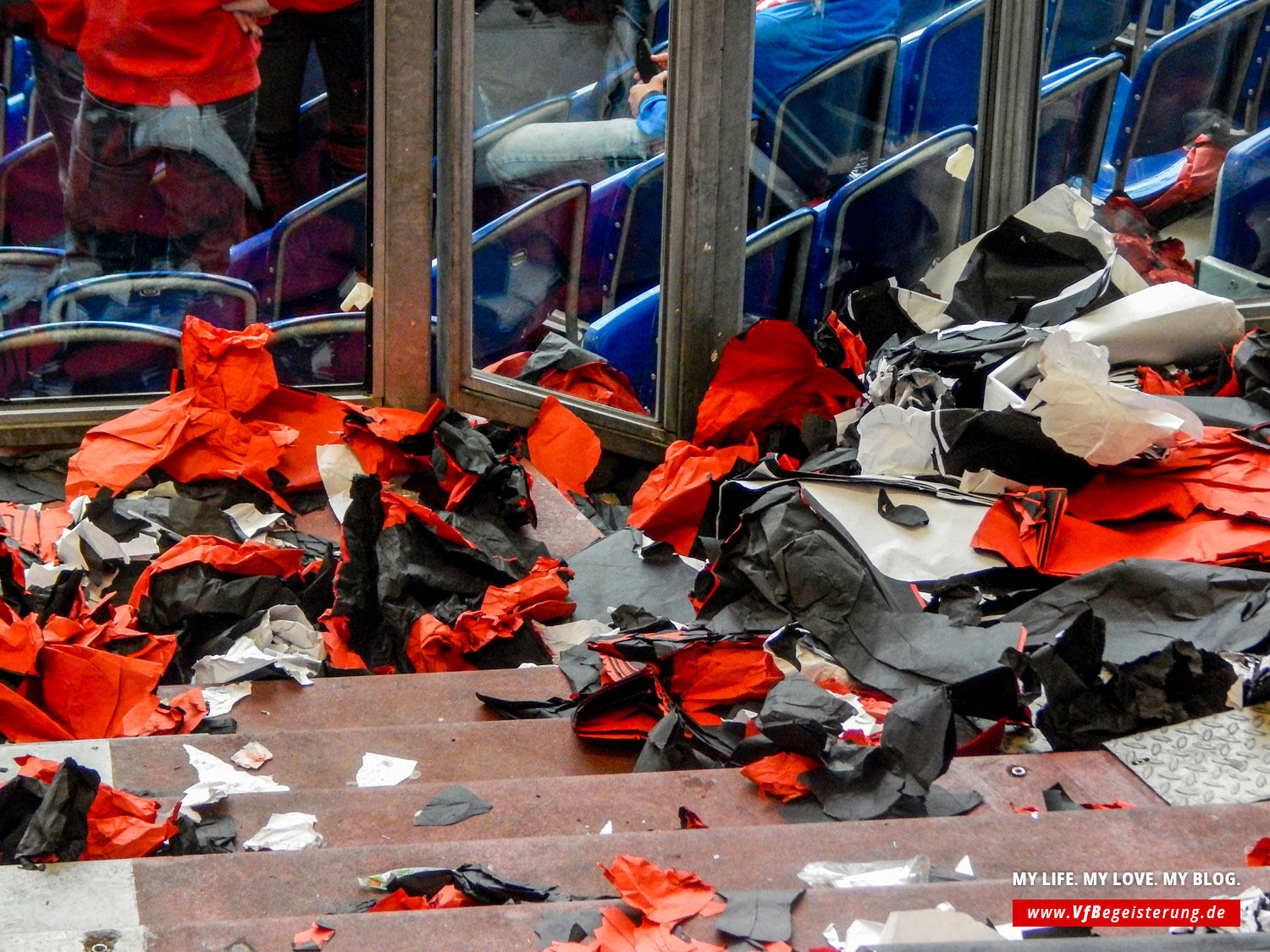 Es dauerte lange, bis sich alle Reihen im Gästeblock gelichtet hatten. Auf dem Boden lagen all die zerknüllten Papptafeln, zertretene Pappbecher und das letzte bisschen Hoffnung, das wir VfB-Fans noch hatte. Zertrampelt unter unseren Füßen, ohne das wir das so gewollt hatten. Minutenlang stand ich da, blickte wortlos umher und wusste nicht, was ich dazu sagen sollte. Das dürfte es gewesen sein. Nur mit viel Mühe konnte mich Felix zum Gehen bewegen.